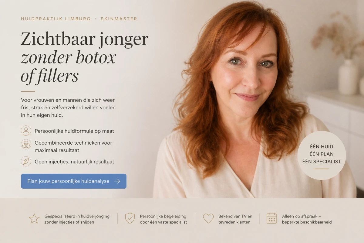 Bij Huidpraktijk Limburg help ik je naar een frissere, strakkere en jongere huid — zonder botox of fillers.